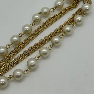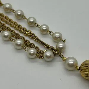 Vintage Faux Pearl Necklace Triple Strand Gold-Tone Chain Tassel Pendant 1970s