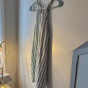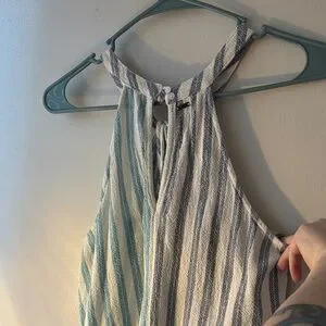 Chic backless dress with blue and white stripes. Perfect for summer outings.