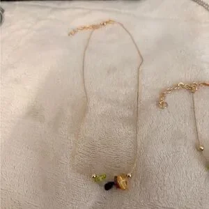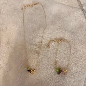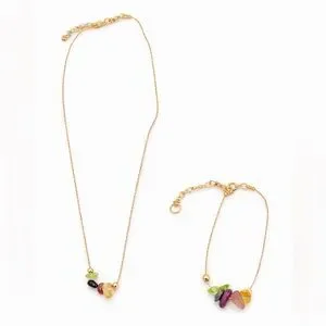 Delicate gemstone chip necklace and bracelet stainless steel set featuring a colorful mix of natural stone chips on a dainty gold tone stainless steel chain. This adjustable set adds a soft boho touch to any outfit and layers beautifully with other jewelry. The vibrant mix of stones gives each piece a unique and earthy feel.