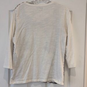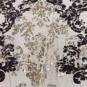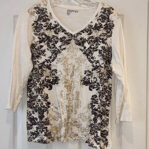 Zenergy cream long-sleeve V-neck top featuring an ornate black print and shimmering gold sequin accents. Lightweight and versatile for everyday or evening wear. Elegant cream, black, and gold color palette adds instant polish to any outfit.
