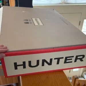 Classic tall rain boots by Hunter. Waterproof rubber construction. Signature logo at the top. Sleek silhouette for rainy days.