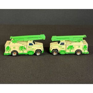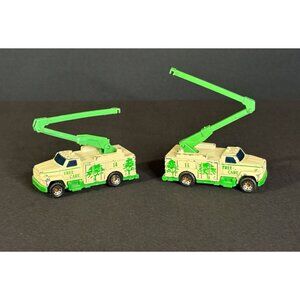 These are two vintage Matchbox "Tree Care" Utility Trucks, modeled after the Ford F-Series. These diecast vehicles were originally produced around 1989 and typically feature a moving boom or "bucket".