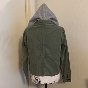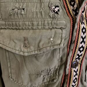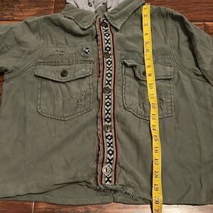 Free People Distressed Green Embroidered Detailing Boho Gray Hoodie Crop Jacket. Size small, has intentional distressing, button closure.