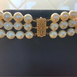 This is a new three strand faux pearl necklace purchased from Neiman Marcus by Kenneth Jay Lane. They have a slightly off white pearly shine and are each hand knotted. Has a 14k gold clasp that snaps in tightly. Perfect for any occasion.