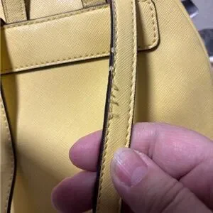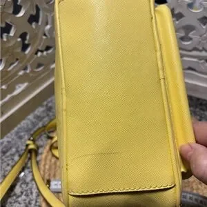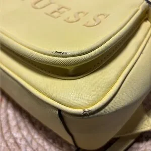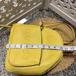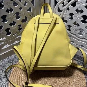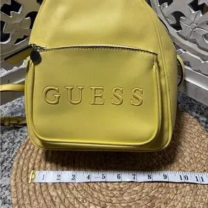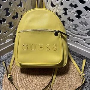 Bright yellow Guess mini backpack with embossed logo. Front zip pocket for small items. Adjustable shoulder straps for comfort. Smooth saffiano-style exterior with zipper closure.