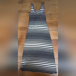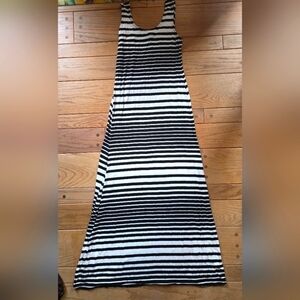 Elegant black and white striped maxi dress suitable for any occasion. It features a comfortable fit and stylish design. In like-new condition. #maxidress #striped #blackandwhite #dress