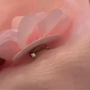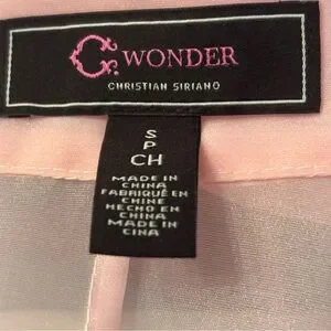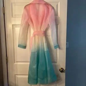 Christian Siriano designed this Lightweight diaphanous Organza trench coat with soft ombre from pink to mint. Referred to as Cherry Blossom. Self-tie 3” wide belt and notched lapel. Delicate pink floral accent is actually a removable pin. Place the pin on your hand bag, waist or lapel. Elegant overlay for your upcoming celebratory events. Look for the matching dress in our closet. This is a beautiful piece, will not disappoint. One of a kind.