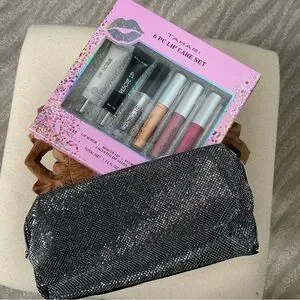 Six-piece Tahari lip care kit. Includes lip scrub, rescue treatment, plumping serum, and three tinted glosses. Packaged in pink box and paired with a sparkly black pouch. Hydrates and adds shine.