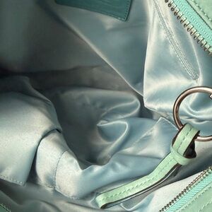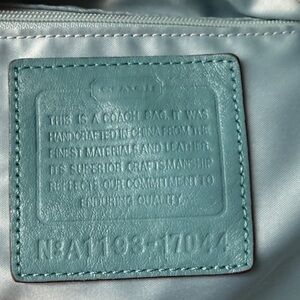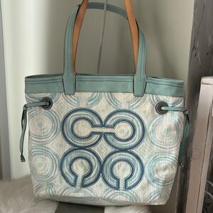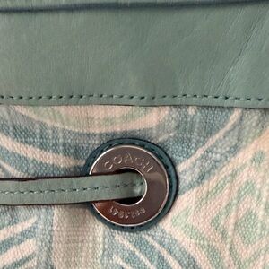 Coach canvas tote with mint blue trim and tan leather handles. Features bold stitched circular logo pattern. Soft mint and blue tones with subtle cream background. Functional top with side tie details. Fresh, casual style for daily use.