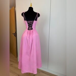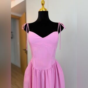 Romantic pink maxi dress featuring a sweetheart bodice, adjustable shoulder ties, and a stunning lace-up back detail. The fitted top flows into a full skirt that moves beautifully and creates a flattering silhouette. Feminine, elegant, and perfect for summer events, brunches, or special occasions.