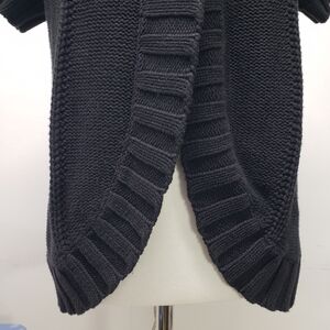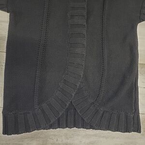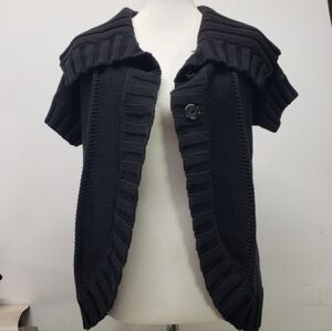Kenneth Cole Reaction, Kenneth Cole cardigan, black cardigan, short sleeve cardigan, ribbed cardigan, open front cardigan, knit cardigan, black sweater, layering piece, wide collar cardigan, button cardigan, women's small cardigan, black ribbed sweater, casual chic, smart casual, work cardigan, office style, classic black, versatile cardigan, Kenneth Cole sweater, short sleeve sweater, spring cardigan, lightweight cardigan, Y2K style, minimalist, everyday cardigan