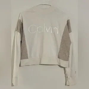 Stylish Calvin Klein cropped sweatshirt in a neutral cream color with soft heather gray panel accents. Features the classic Calvin logo across the chest for a clean, minimal look. Perfect for pairing with high-waisted jeans, leggings, or joggers for an effortless casual outfit.