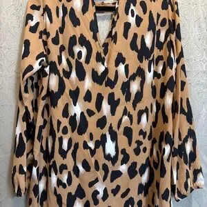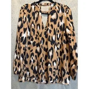 Chic blouse with bold leopard pattern. Features a stylish keyhole neckline. Perfect for versatile wear.