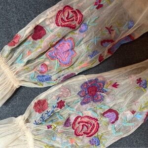 Sheer top with vibrant floral embroidery. Spring floral.