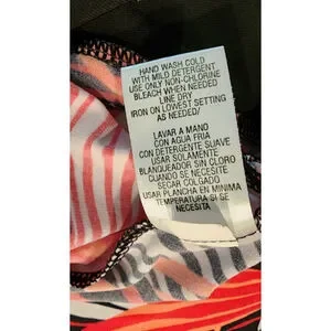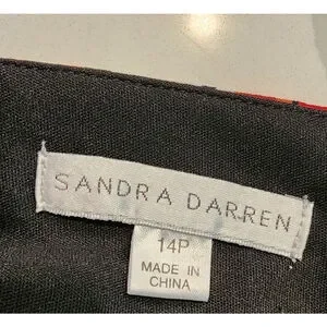 Stunning Sandra Darren petite wrap dress in size 14P (Petite 14 Plus/Petite fit)! Vibrant tropical paradise print with bold coral pink, hot orange, black, and white abstract palm/leaf patterns on a silky smooth poly-spandex blend fabric (95% polyester/5% spandex body for stretch and drape; 100% polyester lining).