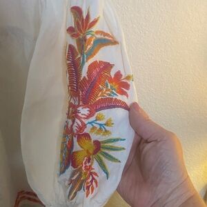 Tommy Bahama white tunic featuring coral and pink embroidered accents. V-neck with embroidered placket. 3/4 sleeves with matching embroidery. Lightweight, breathable fabric. Boho-inspired detailing.