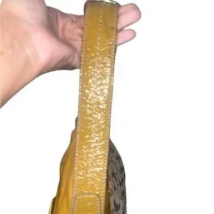 Coach GUC Bleecker Khaki Signature & Tan Patent Leather Shoulder Bag. This Y2K cutie features a front buckle snap closure. Exterior is signature canvas & patent leather with an exterior back slip snap pocket . There are some minor flaws to canvas as there is color transfer on exterior front patent leather, back exterior has a small red spot & a color transfer spot on exterior back patent leather as shown. Shoulder straps are adjustable with some minor color transfer as shown.