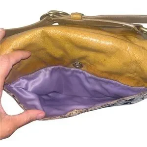 Interior is a pretty Liliac purple, 1 zipper pocket with 2 additional slip pockets no rips & could use a minor cleaning . Perfect for any occasion this bag is stylish & versatile.