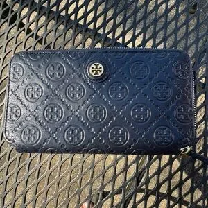 Tory Burch Navy Embossed Wallet w/ multiple card slots & zippered coin storage