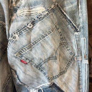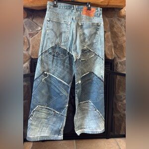 These pants feature a signature multi-pocket, layered aesthetic designed to mimic upcycled vintage denim. While they capture the "remade Levi's" look with their various blue washes and distressed panels, they are a specific production item from the MICAS denim collection.