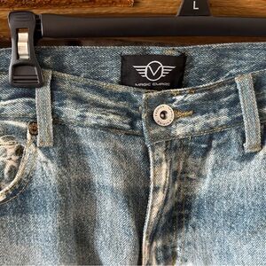 Design: Straight-leg silhouette with unique patchwork overlays, frayed edges, and decorative rivet details.