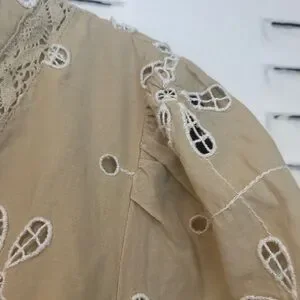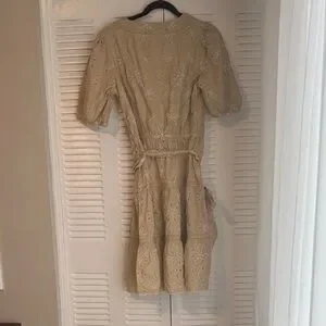 Elegant tan midi dress with intricate embroidery. Features a stylish wrap design. Perfect for any occasion.