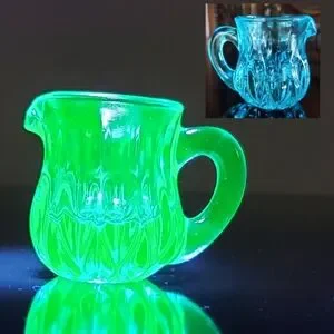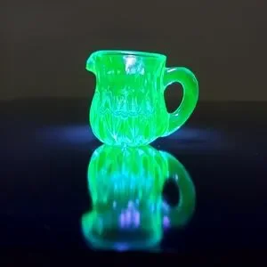 Bright little Glass Pitcher that glows neon green so beautifully under black light by Degenhart is a perfect addition to your collection or a perfect 🎁 gift for someone who appreciates vintage glass!