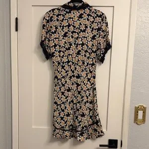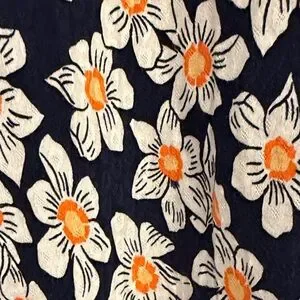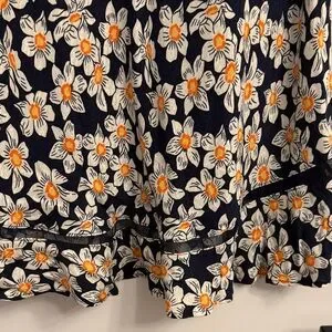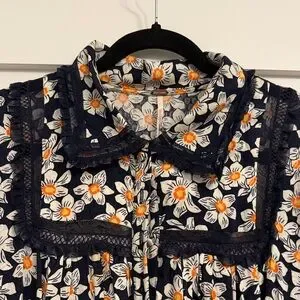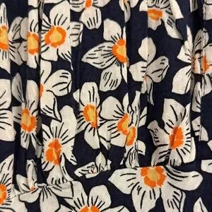 Charming floral dress with short sleeves. Features a navy blue background with white and orange flowers.