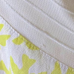 • Sunny Yellow bird print, pin ticking, and eyelet lace in a unique high low cut.