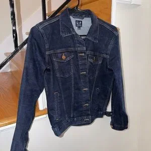 Classic GAP women's jean jacket in dark blue denim. Button-front closure with chest pockets. Tailored seams for a flattering fit. Easy to layer over tops or dresses.