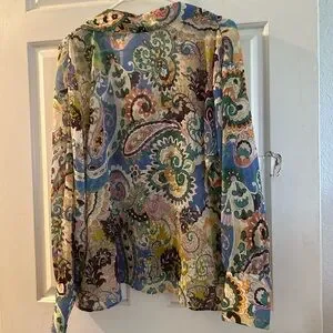 Lightweight paisley button-up blouse. Bright multicolor pattern with blue, green, purple, yellow, pink, and brown accents. Soft flowy fabric. Timeless boho print.NWT
