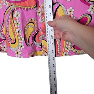 A burst of vibrant energy awaits with this eye-catching skirt! The colorful paisley print pops against a pink backdrop, creating a lively and playful look. A bright pink ribbon adorns the waistband, adding a touch of whimsy and charm. This skirt features a comfortable and flattering A-line silhouette, perfect for twirling through summer days. Imagine pairing this skirt with a crisp white tee and sandals for a casual outing, or dressing it up with a blouse and heels for a garden party or brunch with friends.