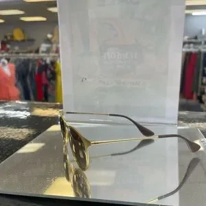 Stylish Ray-Ban sunglasses with gold metal frames. Brown gradient lenses for sun protection. Lightweight and fashionable design. Iconic Ray-Ban logo on the lens.
