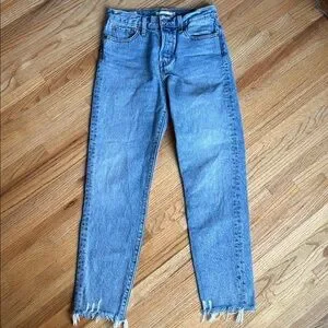 Light blue denim jeans with a high-rise fit. Straight leg with frayed raw hem. Clean, classic styling and five-pocket design. Versatile casual staple.