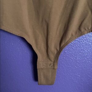 Auden brown tank top bodysuit featuring a scoop neckline and a thong cut with snap closure. Brown tan color