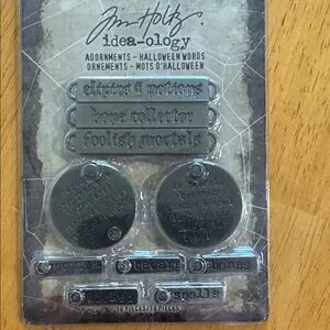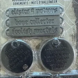 Set of Halloween-themed metal adornments by Tim Holtz. Includes words like 'potions' and 'spells' in silver.