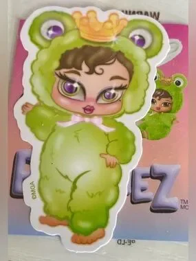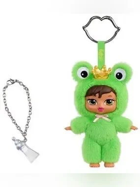 Box is OPENED. Charming green frog doll keychain with a golden crown. Ideal for kids who enjoy playful and cute accessories.