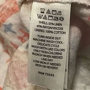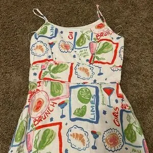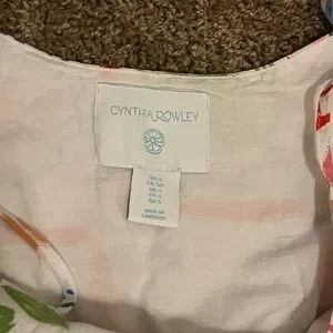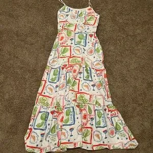 Lightweight maxi dress by Cynthia Rowley. White base with colorful botanical and graphic print. Spaghetti straps and a flowing tiered skirt. Bright, playful summer style.