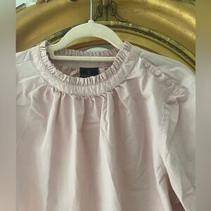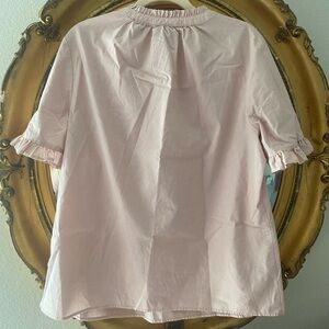 Delicate pale pink blouse with ruffled neckline. Lightweight fabric and gentle gathers for a soft silhouette. Feminine and versatile styling for layering or wearing alone.