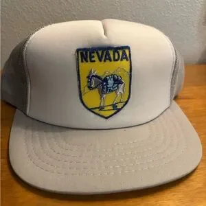 White front vintage trucker cap with gray bill and mesh back. Embroidered yellow and blue Nevada patch with mule graphic. Casual, vintage-inspired look. Adjustable snapback closure.