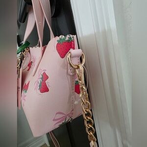 Chic and playful, this Juicy Couture bag features a delightful strawberry print on a pink background. Perfect for adding a touch of fun to any outfit.