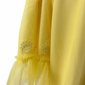 Beautiful JessaKae yellow embroidered dress featuring a delicate tulle skirt and intricate floral embroidery on the bodice. The soft puff sleeves and flowing tulle layers create a dreamy, romantic silhouette.