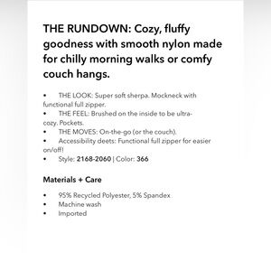 Soft cream sherpa body. Quilted green shoulder panels. Zip-front closure. Relaxed, cozy fit.