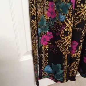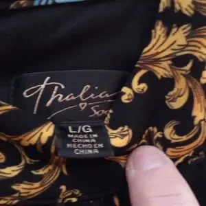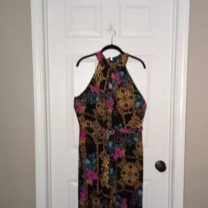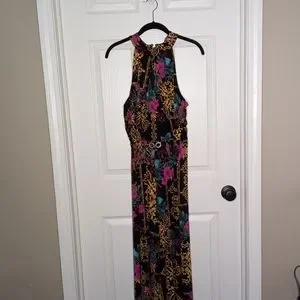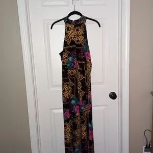 Beautiful jumpsuit by THALIA SODI in a size large. This has only been worn 1 time on a cruise last year. It has a rhinestone detail at the waist with flowing pant legs that almost makes it appear as you are wearing a dress. Measurements: Pit to Pit 19 in Top of neck to bottom hem is 61 in. Inseam is 28 in and lying flat is 16 in across the waist.