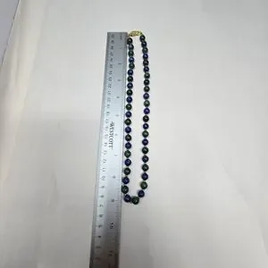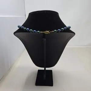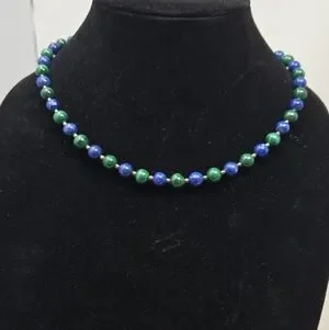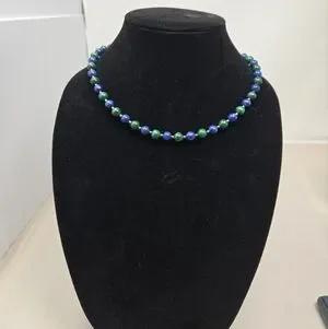 This vintage Lapis Lazuli round beaded women's necklace features a gold-coated silver clasp, adding a touch of elegance to the piece. With a necklace length of 18 inches, this fine jewelry item is perfect for occasions like Mother's Day, Christmas, weddings, anniversaries, birthdays, and Valentine's Day The beautiful blue Lapis Lazuli stones set in a beaded style make this necklace a unique and eye-catching accessory for any woman's collection.