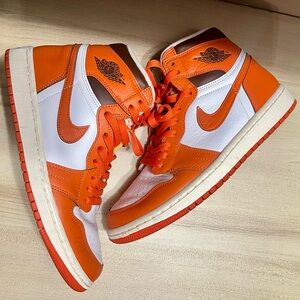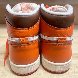 Authentic Nike Air Jordan 1 Retro High OG in the highly sought-after Starfish colorway. This classic Jordan silhouette features premium white leather with vibrant Starfish orange overlays and brown accents around the collar, inspired by the iconic Shattered Backboard color palette.