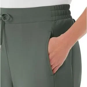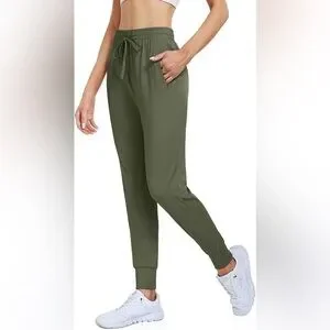 The pants include an elastic waistband with an adjustable drawstring, two side pockets, a back yoke seam, and rib cuffs at the hem.