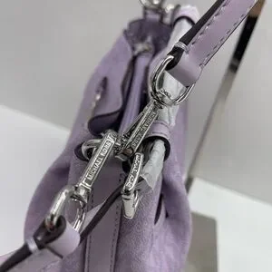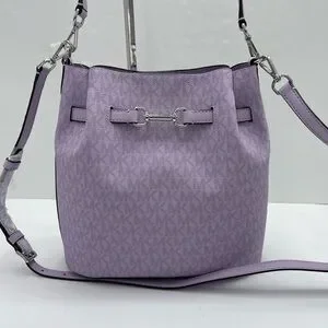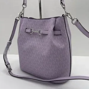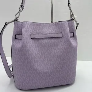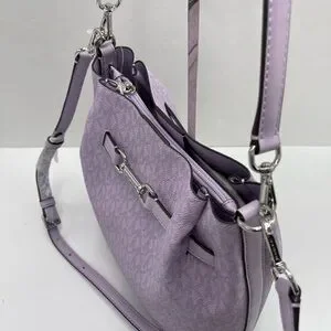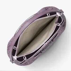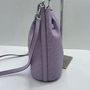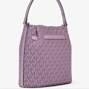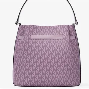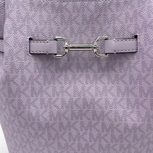 Michael Kors shoulder tote with signature MK pattern. Soft purple leather-look exterior. Polished silver-tone hardware detail. Single adjustable shoulder strap for easy wear. Chic everyday carry with subtle branding.