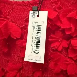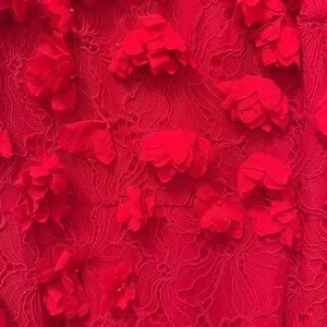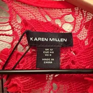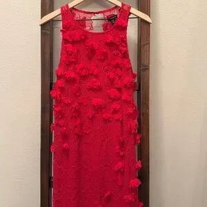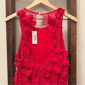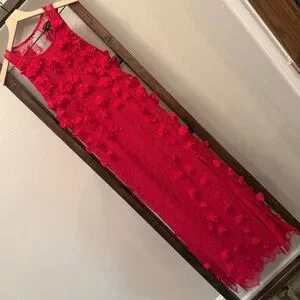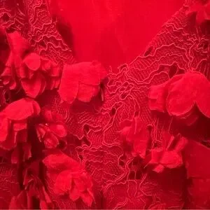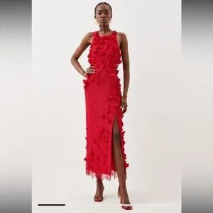 Beautiful NWT Karen Millen red midi dress featuring intricate lace with dimensional 3D floral appliqué detailing throughout. This elegant column silhouette has a racer-style neckline and a subtle side slit for movement, making it perfect for weddings, formal events, holiday parties, or special occasions.