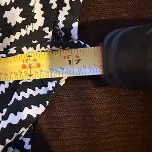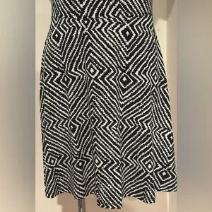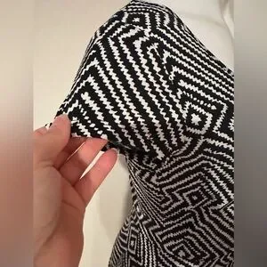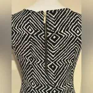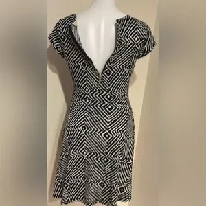 This mini dress with bold geometric design. Features classic black and white colors. Ideal for stylish outings. Measurements approximately armpit. to armpit is 17 inches. Length is 34 inches. Waist is 19 inches.